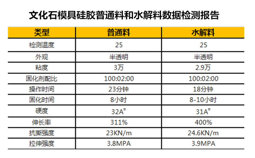 根據下面的文化石模具硅膠的普通料和水解料數據檢測報告可以看出,水解料生產出來的模具硅膠看上去和普通料生產的相關不了多少,但這問題在使用一段時間后就會明顯的凸顯出來。